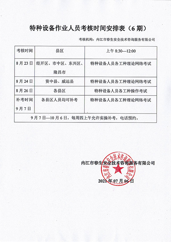 2021年春生公司06期特種設備作業(yè)人員考核時間安排