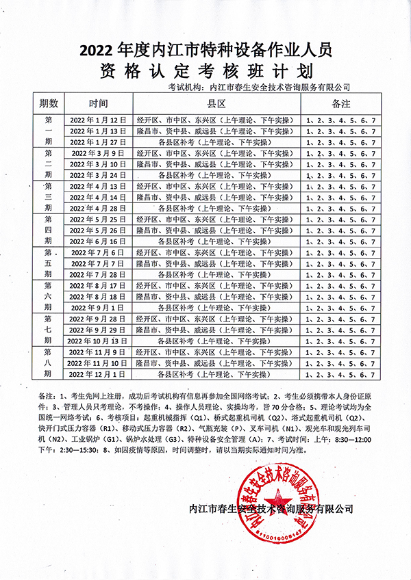 2022年春生公司05期特種設(shè)備作業(yè)人員考核時間安排