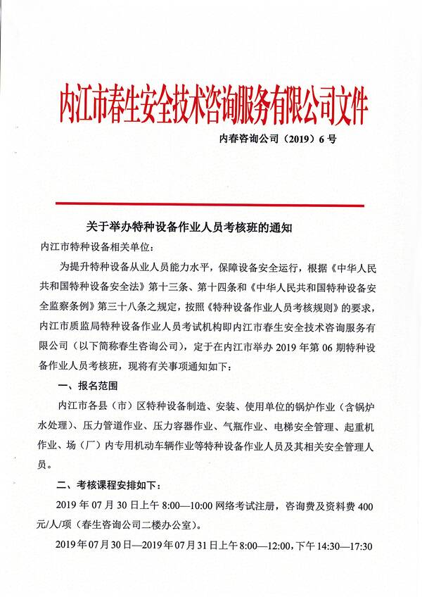 2019年第六期特種設備作業(yè)人員考核培訓班的通知