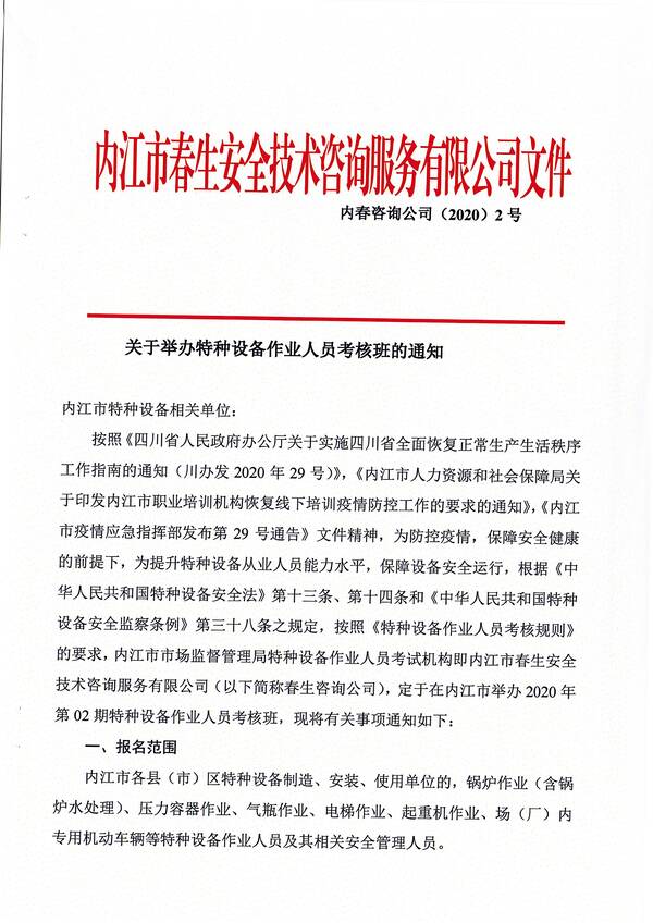 2020年第一期特種設(shè)備作業(yè)人員考核培訓(xùn)班的通知