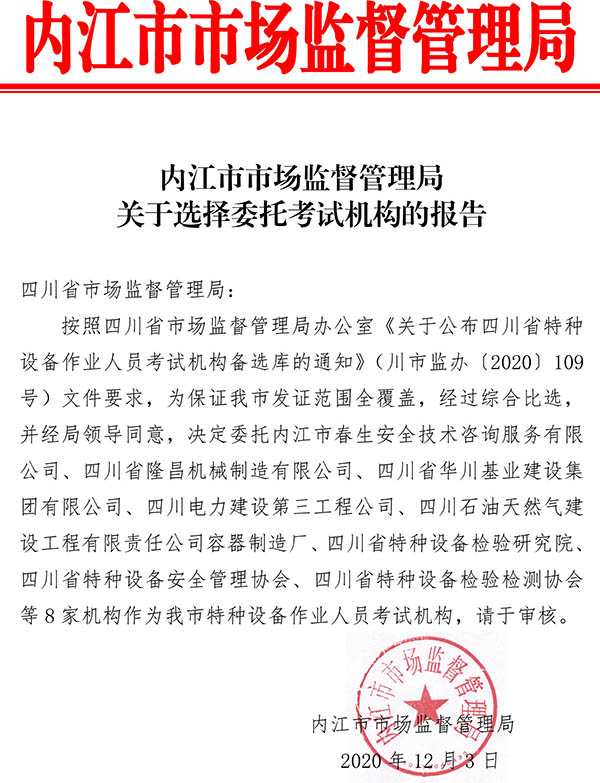 內江市市場監(jiān)督管理關于選擇委托考試機構的報告